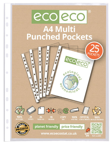Multi Punched Pockets A4 ECO - Standard/Pkt x 25 sleeves. Browse and explore our full range of products on this site. Use our powerful filters, or simply search using the search bar above. Add to your cart with 1 simple click.
